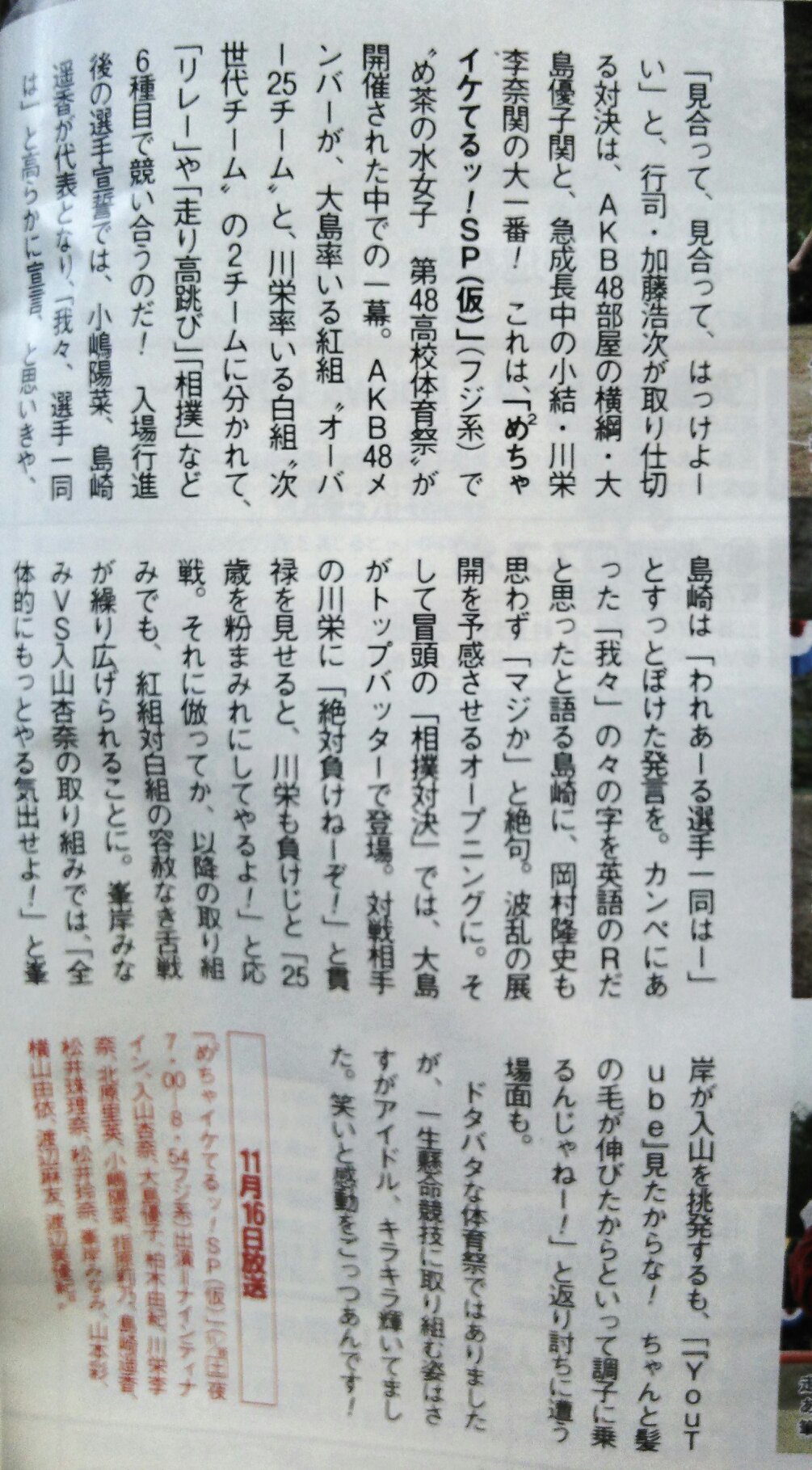 11/16(土) 19:00-20:54 CX* 「めちゃ×2イケてるッ! AKB48グループ大運動会 2時間スペシャル」