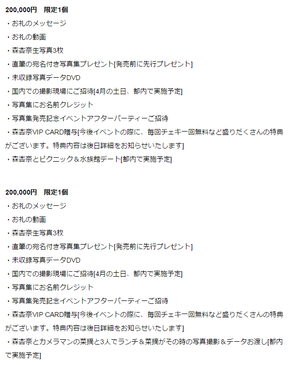 > ・森杏奈とカメラマンの菜摘と3人でランチ&菜摘がその時の写真撮影&データお渡し[都内で実施予定]