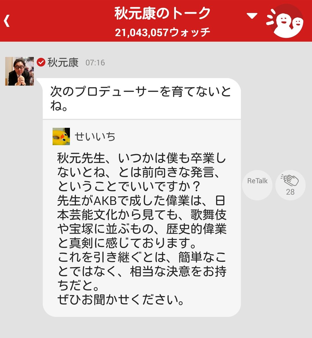 「先生がAKBで成した偉業は、日本芸能文化から見ても、歌舞伎や宝塚に並ぶもの、歴史的偉業と真剣に感じております」って…