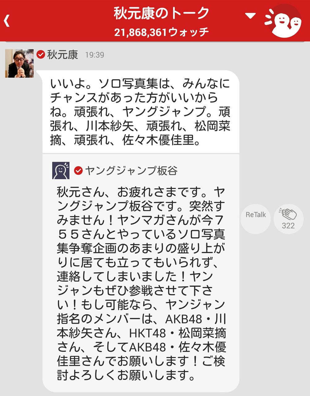 ヤンジャンも755に緊急参戦!ヤンジャンが選んだ3人のAKB48次世代メンバーに個人トークのウォッチ数の伸び数で勝負していただき、一番ウォッチ数が伸びたメンバー1名に、ソロ写真集出版権が与えられます!