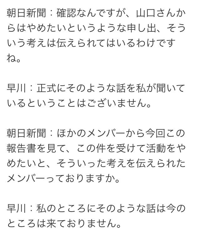 朝日新聞:ほかのメンバーから今回この報告書を見て、この件を受けて活動をやめたいと、そういった考えを伝えられたメンバーっておりますか。