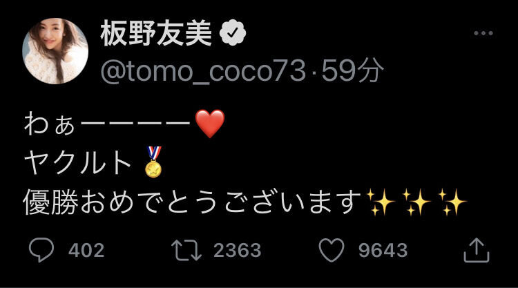 板野友美 ヤクルトV祝福「わぁーーーーおめでとうございます」夫・高橋奎二は勝利投手