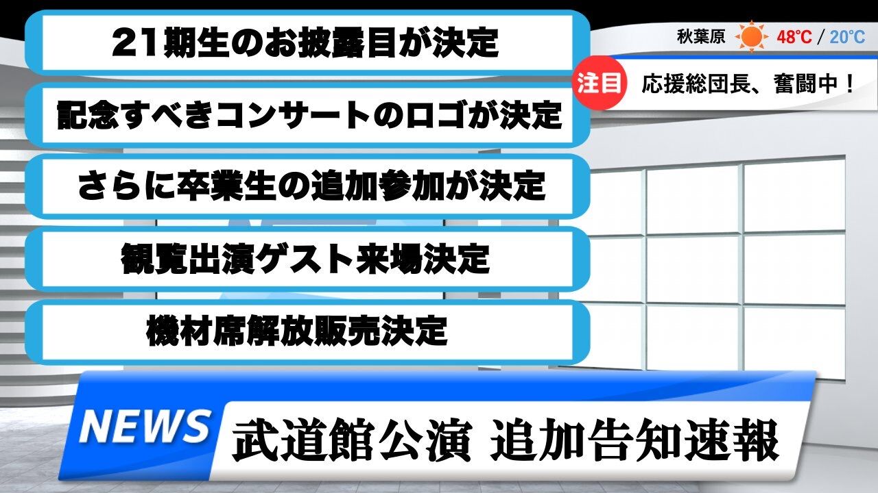 12月4日(木)開催の「リクエストアワー セットリストベスト20」にて、21期生をお披露目することが決定いたしました!記念すべき20周年公演、日本武道館でデビューを迎える、次代を担う研究生の第一歩をぜひ会場でご覧ください!
