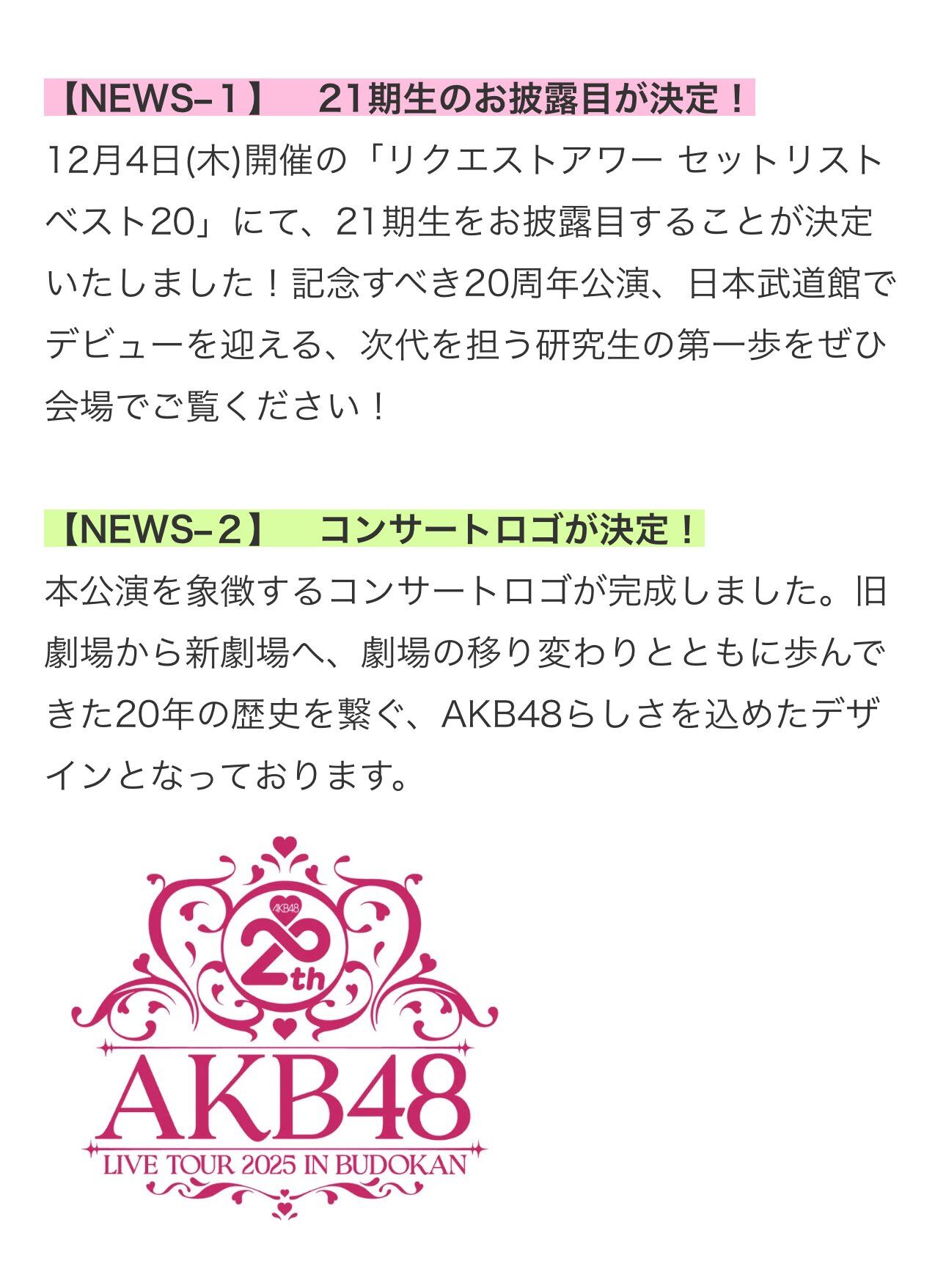 【NEWS–1】 21期生のお披露目が決定!