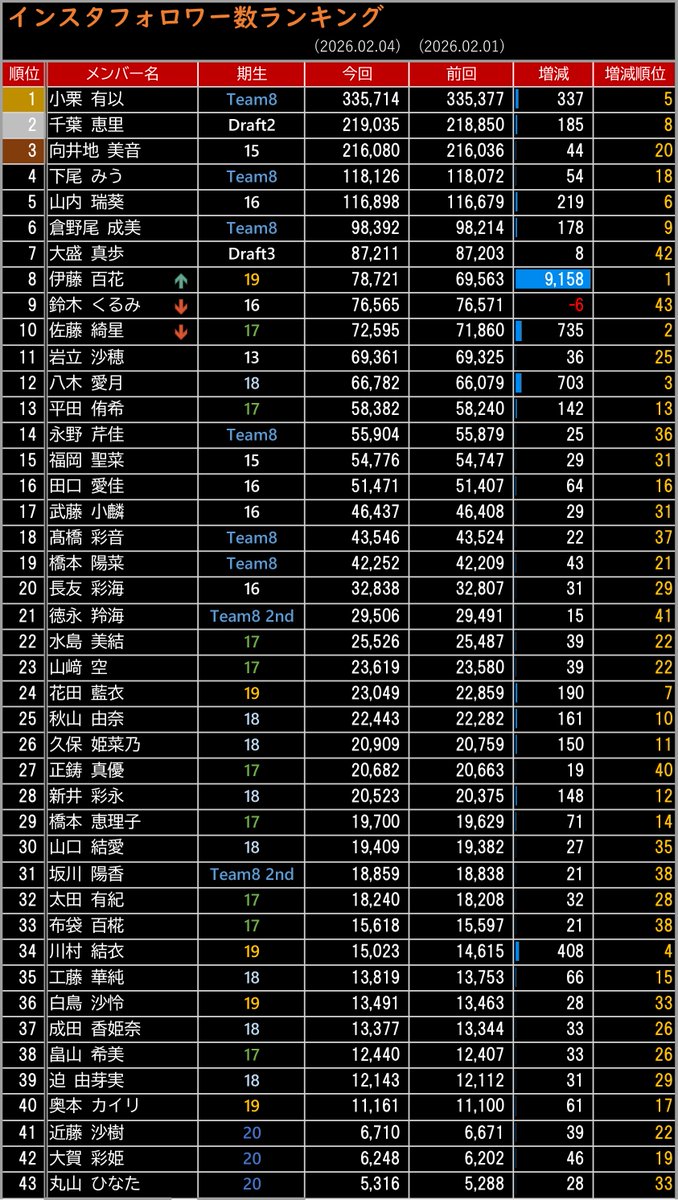 ☑︎ 伊藤百花が78,000突破し佐藤綺星、鈴木くるみを抜いて8位に