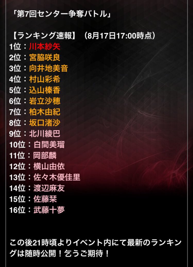 LINE LIVE特番内で発表いたしました8月17日17時時点の「第7回センター争奪バトル」ランキング速報です
