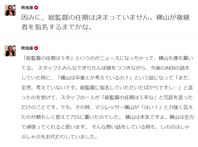 次期総監督に任命され、現在ライブの締めコメントや円陣、総括などこれまで高橋が担ってきた役割を引き継ぎ中という横山は、