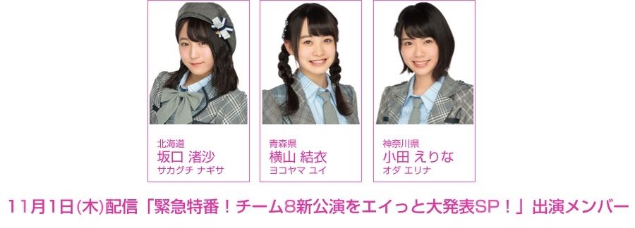 11月1日(木)19:00から、「緊急特番!チーム8新公演をエイっと大発表SP!」のSHOWROOM配信が決定しました!!