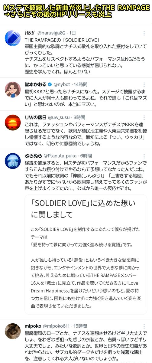 批判の声を受け、「THE RAMPAGE一同」名義で22日、レコード会社「エイベックス」の公式サイト上で「『SOLDIER LOVE』に込めた想いに関しまして」と題する声明文を発表。同曲について次のように見解を述べた。