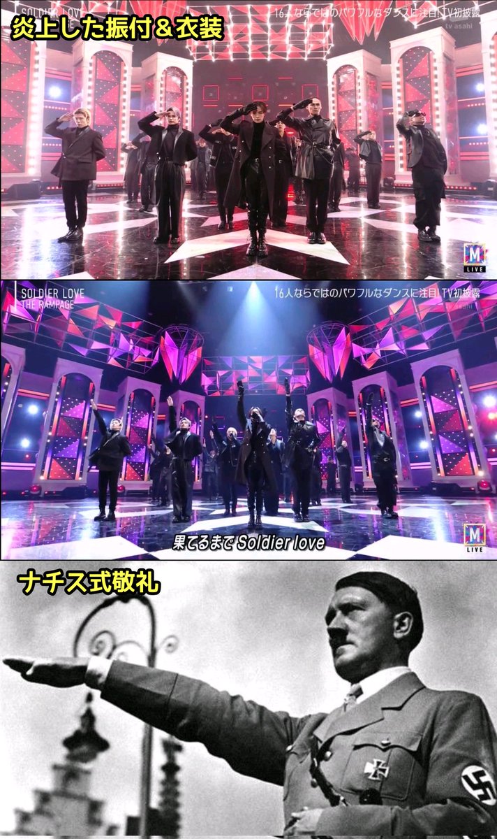 声明文が公表された日の夜に放送された「ミュージックステーション」(テレビ朝日系)に同グループが出演し、「SOLDIER LOVE」を披露した。パフォーマンス中に、右手を斜め前方に掲げるナチス式の敬礼に似た振り付けがあったとして、インターネット上で再び批判を浴びた。