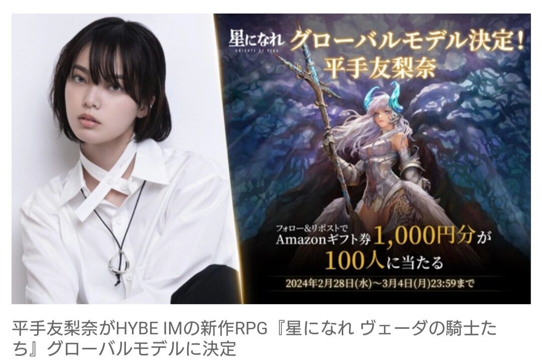 平手友梨奈(22)が、所属する韓国の総合エンターテインメント企業・HYBEのゲーム事業部門であるHYBE IMが2024年春にリリースするPCおよびスマートフォン向けの新作RPG『星になれ ヴェーダの騎士たち』のグローバルモデルに決定し、メインテーマ「絶望の女神」を歌唱することが決定した。